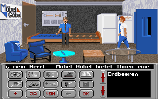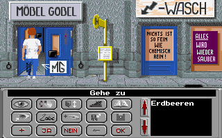The commands are obviously inspired by the early LucasArts adventures, although the game already uses icons instead of plain text buttons. It's still more inconvenient, though, as hotspot names only appear after clicking on them. The commands are look at, use, open/close, go (has to be selected each time before going somewhere), read (very important and distinguished from look at), take (something out of), write (completely useless cause you only have to write something once, and then it can be done by using the pen with the paper), buy, sit down (useless), and save.
