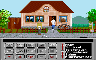 Das Erbe ("The Heritage") was actually the first point & click adventure game I ever played, on a friend's Amiga (all the screenshots here are from the IBM PC version, which has slightly retouched graphics). Commissioned by the German Federal Environmental Agency, it's all about preserving the earth's atmosphere. You play as some dude how inherited a house and three million Deutsche Mark from his late uncle, under the condition that he'd renovate the house without damaging the environment.